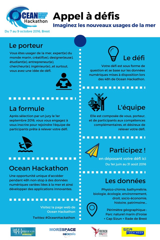 • #Ocean Hackathon, c'est 48h pour décoder la mer, du 7 au 9 octobre 2016. Nous vous invitons dès maintenant à proposer vos défis. Ces défis seront autant de points d'ancrage pour la formation des équipes de hackathoniens.